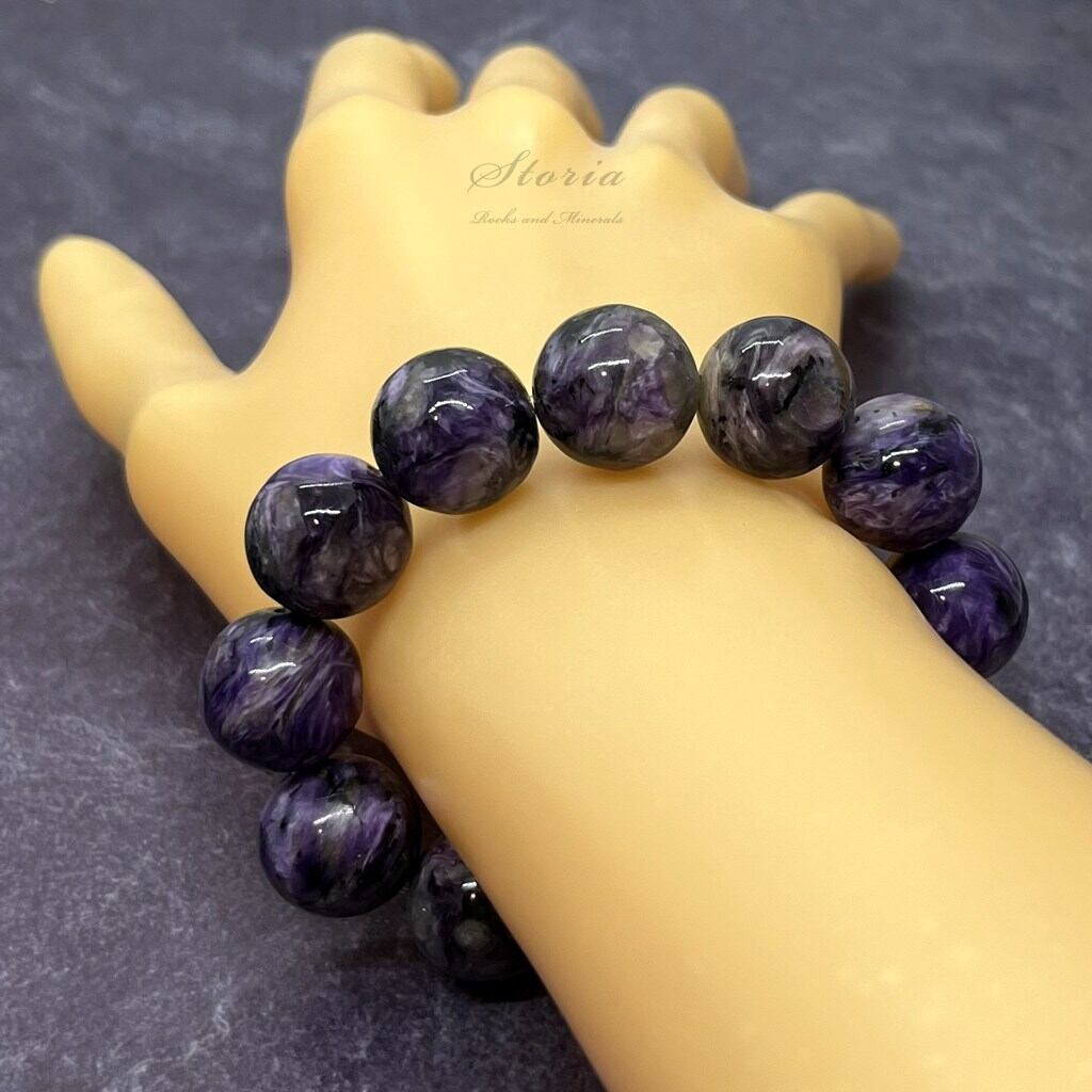 このブレスレットは、世界で唯一、ロシアのサハ共和国(旧シベリア・チャロ川流域)でのみ産出されるチャロアイトを使用しています。