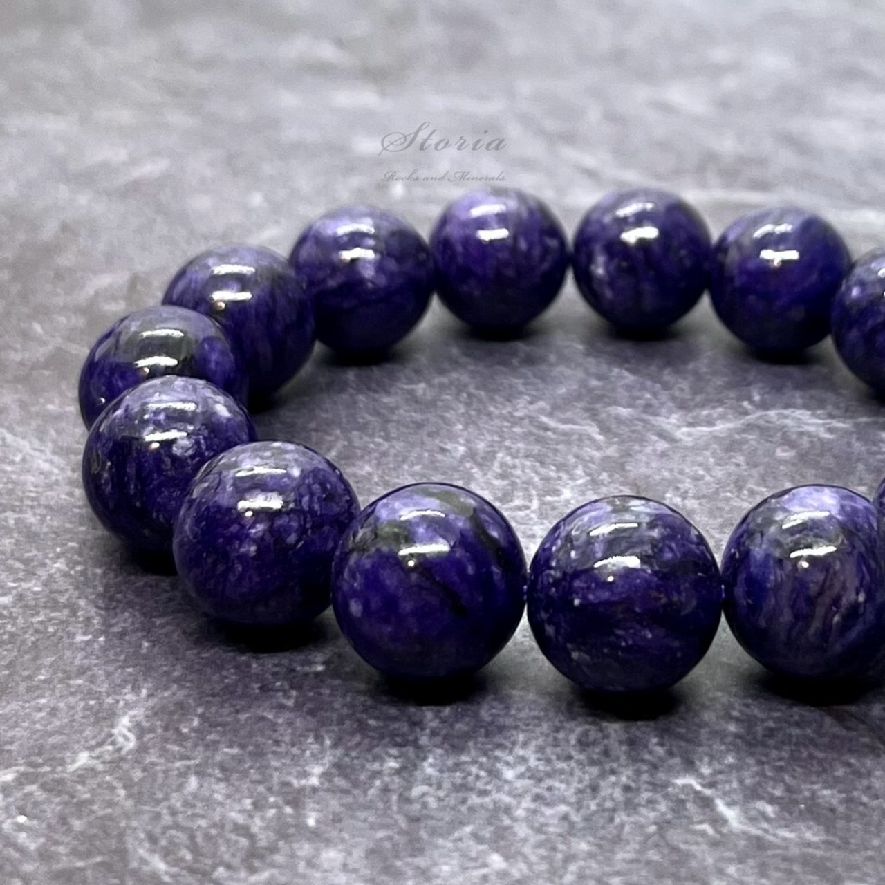 このブレスレットは、世界で唯一の産地であるロシア・サハ共和国から採掘された、極めて色味が濃く、高品質なチャロアイトを使用しています。
