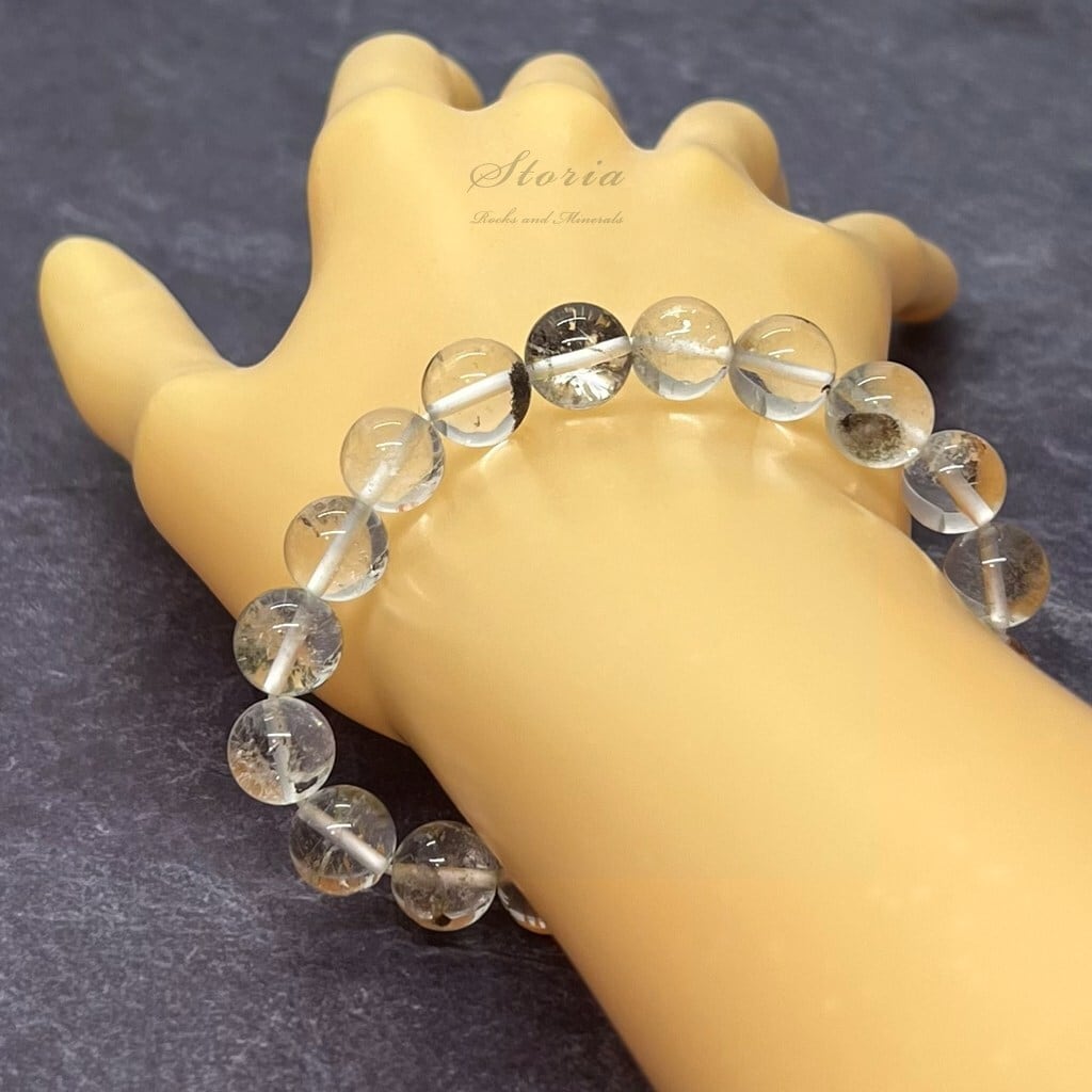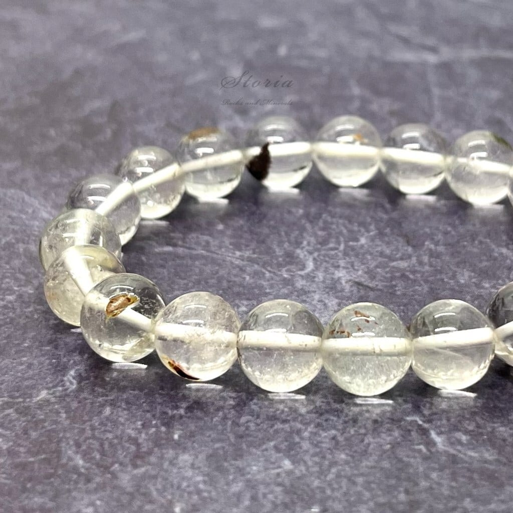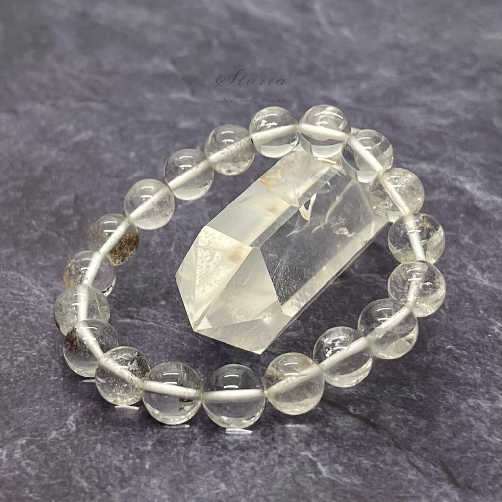 ヒマラヤ山脈の聖地、ガネーシュヒマール産の清らかな水晶に、内包物(インクルージョン)が閉じ込められた、特別なライモナイト入りガーデンクォーツブレスレットです。