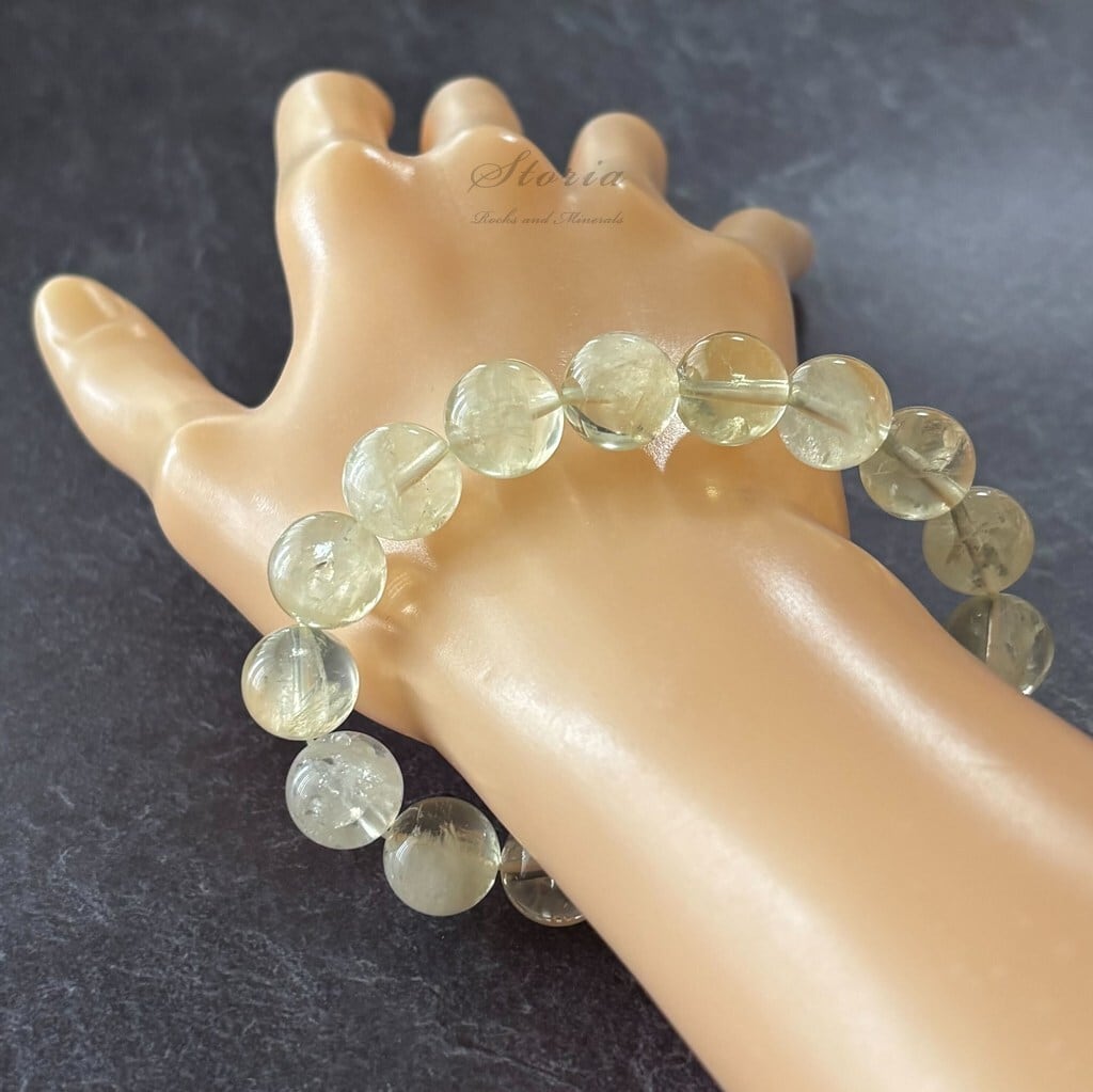 12mmサイズのレモンクォーツは、その透明感ゆえに肌の上でより美しく映えます。