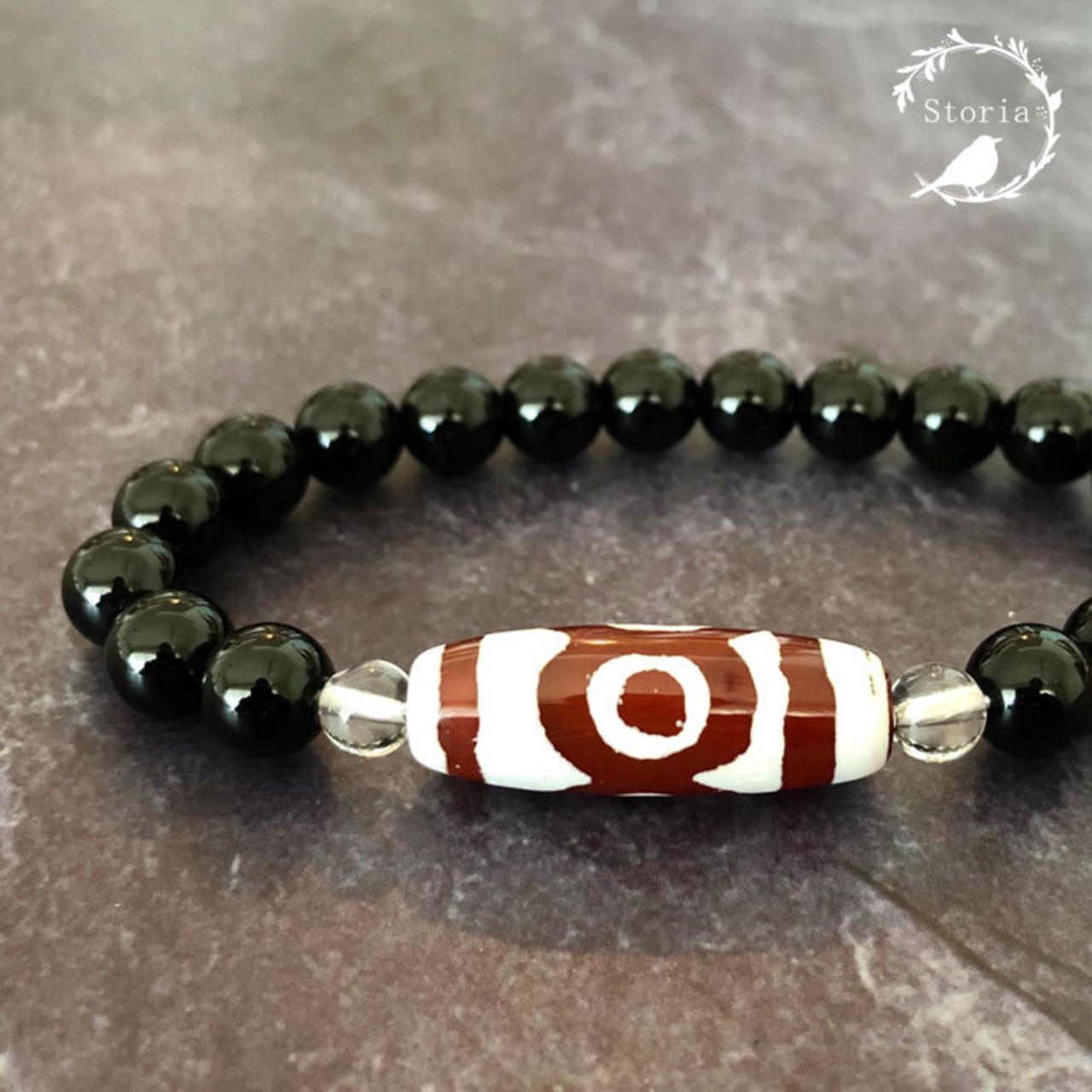 仏の第三の目を象徴しており、ふたつの眼では見えない縁を見る目とされています。成功の象徴として大切に扱われてきた歴史があり、天の時、地の利、人の和を得て成功に導くと言われています。また、幸福や財を呼び寄せるとされるため、現代でも支持を得ている天珠です。