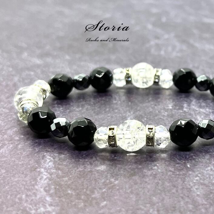 クールな印象のブラックオニキスに、カット加工された水晶で煌めきをプラスしたデザインブレスレットです。